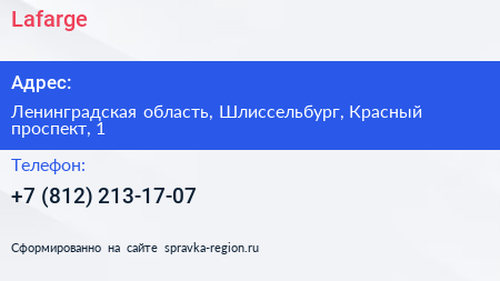 Lafarge по адресу Ленинградская область, Шлиссельбург, Красный проспект, 1 в дальнейшем Организация, размещена в следующих категориях: