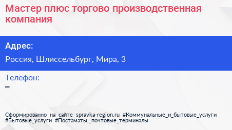 Мастер-плюс, торгово-производственная компания по адресу 3, улица Мира, посёлок имени Морозова, Морозовское городское поселение, Всеволожский район, Ленинградская область, Северо-Западный федеральный округ, 188679, Россия в дальнейшем Организация, размещена в следующих категориях: