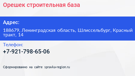 Орешек, строительная база по адресу 188679, Ленинградская область, Шлиссельбург, Красный тракт, 14 в дальнейшем Организация, размещена в следующих категориях: