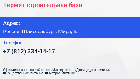Термит, строительная база по адресу улица Мира, посёлок имени Морозова, Морозовское городское поселение, Всеволожский район, Ленинградская область, Северо-Западный федеральный округ, 188679, Россия в дальнейшем Организация, размещена в следующих категориях: