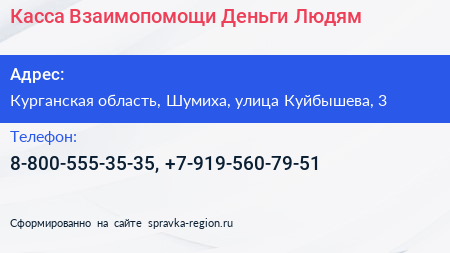 Касса Взаимопомощи Деньги Людям по адресу Курганская область, Шумиха, улица Куйбышева, 3 в дальнейшем Организация, размещена в следующих категориях: