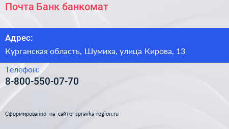 Почта Банк, банкомат по адресу Курганская область, Шумиха, улица Кирова, 13 в дальнейшем Организация, размещена в следующих категориях: