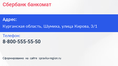 Сбербанк, банкомат по адресу Курганская область, Шумиха, улица Кирова, 3/1 в дальнейшем Организация, размещена в следующих категориях: