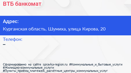 ВТБ, банкомат по адресу Курганская область, Шумиха, улица Кирова, 20 в дальнейшем Организация, размещена в следующих категориях: