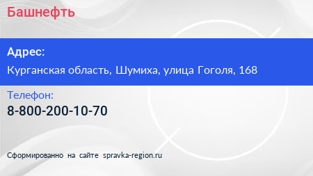 Башнефть по адресу Курганская область, Шумиха, улица Гоголя, 168 в дальнейшем Организация, размещена в следующих категориях: