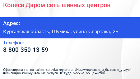 Колеса Даром, сеть шинных центров по адресу Курганская область, Шумиха, улица Спартака, 2Б в дальнейшем Организация, размещена в следующих категориях: