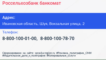 Россельхозбанк, банкомат по адресу Ивановская область, Шуя, Вокзальная улица, 2 в дальнейшем Организация, размещена в следующих категориях: