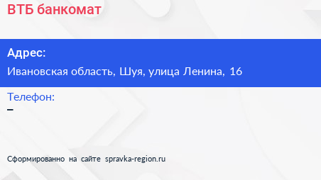 ВТБ, банкомат по адресу Ивановская область, Шуя, улица Ленина, 16 в дальнейшем Организация, размещена в следующих категориях:
