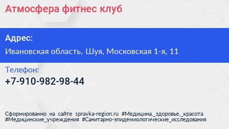 Атмосфера, фитнес-клуб по адресу Ивановская область, Шуя, Московская 1-я, 11 в дальнейшем Организация, размещена в следующих категориях: