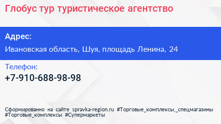 Глобус тур, туристическое агентство по адресу Ивановская область, Шуя, площадь Ленина, 24 в дальнейшем Организация, размещена в следующих категориях: