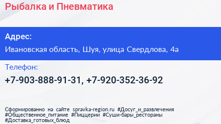 Рыбалка и Пневматика по адресу Ивановская область, Шуя, улица Свердлова, 4а в дальнейшем Организация, размещена в следующих категориях:
