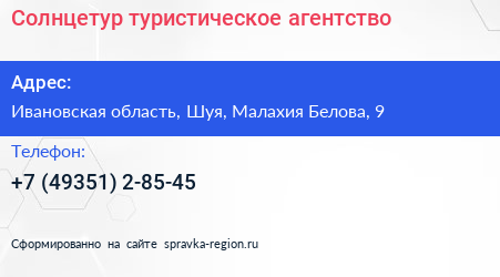 Солнцетур, туристическое агентство по адресу Ивановская область, Шуя, Малахия Белова, 9 в дальнейшем Организация, размещена в следующих категориях: