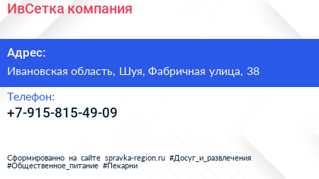 ИвСетка, компания по адресу Ивановская область, Шуя, Фабричная улица, 38 в дальнейшем Организация, размещена в следующих категориях: