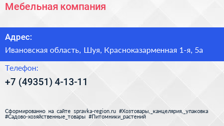 Мебельная компания по адресу Ивановская область, Шуя, Красноказарменная 1-я, 5а в дальнейшем Организация, размещена в следующих категориях: