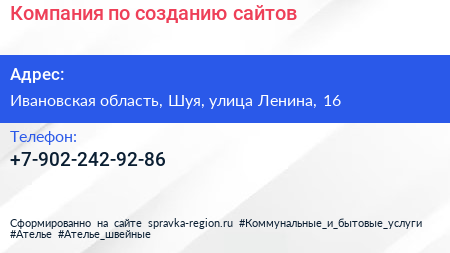 Компания по созданию сайтов по адресу Ивановская область, Шуя, улица Ленина, 16 в дальнейшем Организация, размещена в следующих категориях: