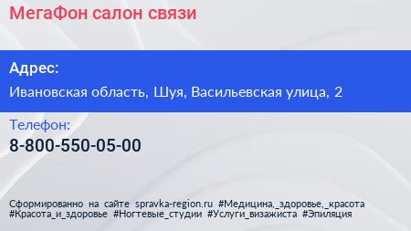 МегаФон, салон связи по адресу Ивановская область, Шуя, Васильевская улица, 2 в дальнейшем Организация, размещена в следующих категориях: