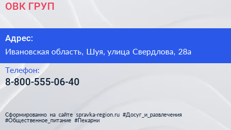 ОВК ГРУП по адресу Ивановская область, Шуя, улица Свердлова, 28а в дальнейшем Организация, размещена в следующих категориях: