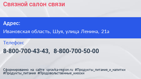 Связной, салон связи по адресу Ивановская область, Шуя, улица Ленина, 21а в дальнейшем Организация, размещена в следующих категориях: