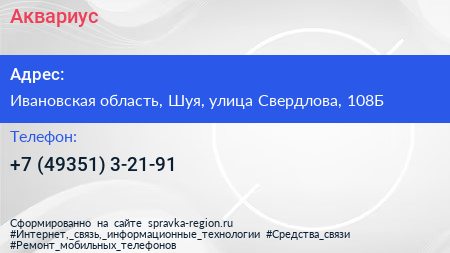 Аквариус по адресу Ивановская область, Шуя, улица Свердлова, 108Б в дальнейшем Организация, размещена в следующих категориях: