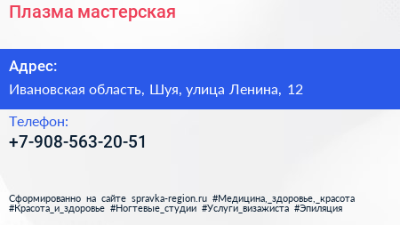 Плазма, мастерская по адресу Ивановская область, Шуя, улица Ленина, 12 в дальнейшем Организация, размещена в следующих категориях: