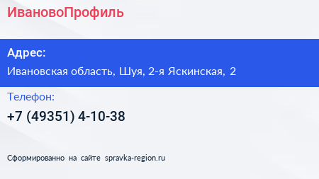 ИвановоПрофиль по адресу Ивановская область, Шуя, 2-я Яскинская, 2 в дальнейшем Организация, размещена в следующих категориях: