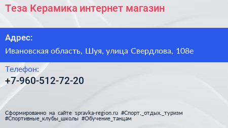 Теза-Керамика, интернет-магазин по адресу Ивановская область, Шуя, улица Свердлова, 108е в дальнейшем Организация, размещена в следующих категориях: