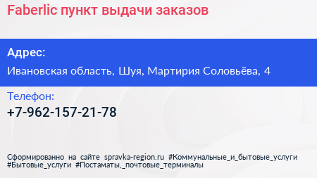 Faberlic, пункт выдачи заказов по адресу Ивановская область, Шуя, Мартирия Соловьёва, 4 в дальнейшем Организация, размещена в следующих категориях: