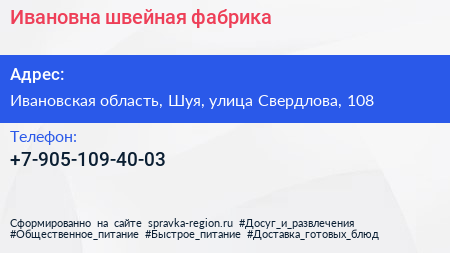 Ивановна, швейная фабрика по адресу Ивановская область, Шуя, улица Свердлова, 108 в дальнейшем Организация, размещена в следующих категориях: