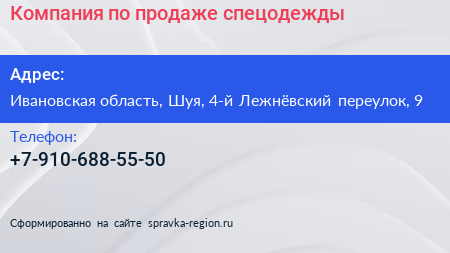 Компания по продаже спецодежды по адресу Ивановская область, Шуя, 4-й Лежнёвский переулок, 9 в дальнейшем Организация, размещена в следующих категориях: