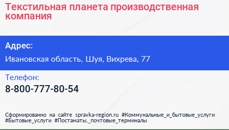 Текстильная планета, производственная компания по адресу Ивановская область, Шуя, Вихрева, 77 в дальнейшем Организация, размещена в следующих категориях: