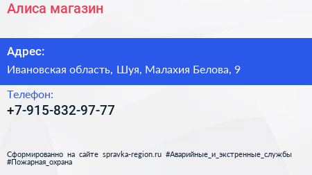 Алиса, магазин по адресу Ивановская область, Шуя, Малахия Белова, 9 в дальнейшем Организация, размещена в следующих категориях: