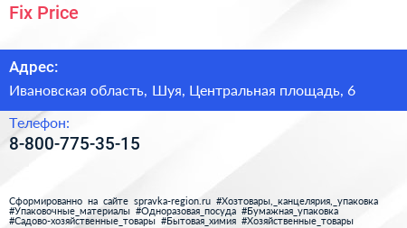 Fix Price по адресу Ивановская область, Шуя, Центральная площадь, 6 в дальнейшем Организация, размещена в следующих категориях: