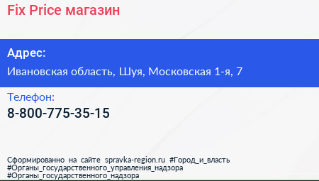 Fix Price, магазин по адресу Ивановская область, Шуя, Московская 1-я, 7 в дальнейшем Организация, размещена в следующих категориях: