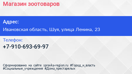 Магазин зоотоваров по адресу Ивановская область, Шуя, улица Ленина, 23 в дальнейшем Организация, размещена в следующих категориях: