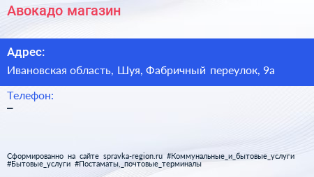 Авокадо, магазин по адресу Ивановская область, Шуя, Фабричный переулок, 9а в дальнейшем Организация, размещена в следующих категориях: