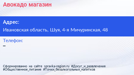 Авокадо, магазин по адресу Ивановская область, Шуя, 4-я Мичуринская, 48 в дальнейшем Организация, размещена в следующих категориях: