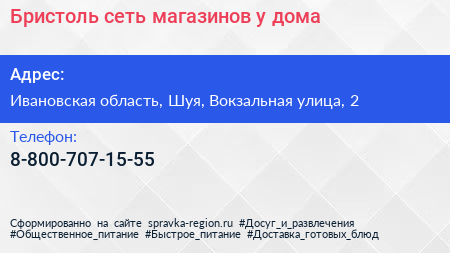 Бристоль, сеть магазинов у дома по адресу Ивановская область, Шуя, Вокзальная улица, 2 в дальнейшем Организация, размещена в следующих категориях: