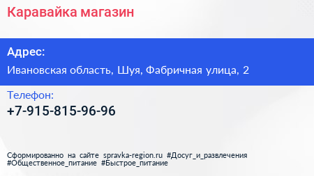 Каравайка, магазин по адресу Ивановская область, Шуя, Фабричная улица, 2 в дальнейшем Организация, размещена в следующих категориях:
