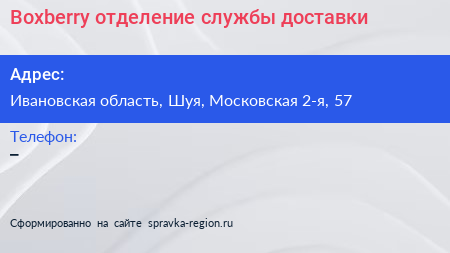 Boxberry, отделение службы доставки по адресу Ивановская область, Шуя, Московская 2-я, 57 в дальнейшем Организация, размещена в следующих категориях: