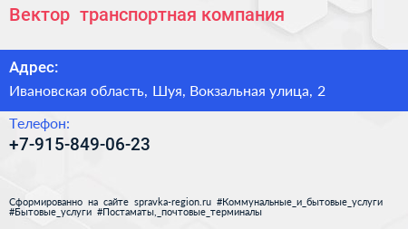 Вектор+, транспортная компания по адресу Ивановская область, Шуя, Вокзальная улица, 2 в дальнейшем Организация, размещена в следующих категориях: