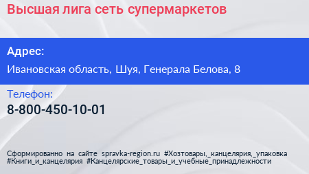Высшая лига, сеть супермаркетов по адресу Ивановская область, Шуя, Генерала Белова, 8 в дальнейшем Организация, размещена в следующих категориях: