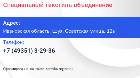 Специальный текстиль, объединение по адресу Ивановская область, Шуя, Советская улица, 12а в дальнейшем Организация, размещена в следующих категориях: