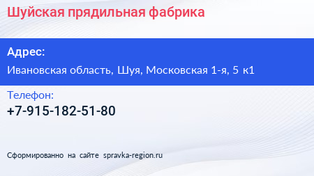 Шуйская прядильная фабрика по адресу Ивановская область, Шуя, Московская 1-я, 5 к1 в дальнейшем Организация, размещена в следующих категориях: