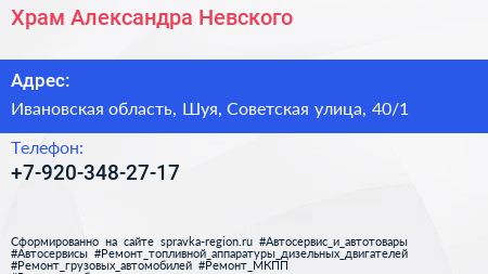 Храм Александра Невского по адресу Ивановская область, Шуя, Советская улица, 40/1 в дальнейшем Организация, размещена в следующих категориях: