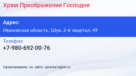 Храм Преображения Господня по адресу Ивановская область, Шуя, 2-й квартал, 49 в дальнейшем Организация, размещена в следующих категориях: