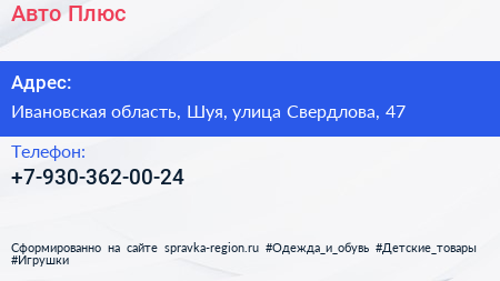 Авто Плюс по адресу Ивановская область, Шуя, улица Свердлова, 47 в дальнейшем Организация, размещена в следующих категориях:
