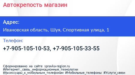 Автокрепость, магазин по адресу Ивановская область, Шуя, Спортивная улица, 1 в дальнейшем Организация, размещена в следующих категориях: