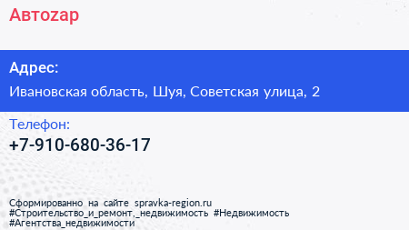 Автоzap по адресу Ивановская область, Шуя, Советская улица, 2 в дальнейшем Организация, размещена в следующих категориях: