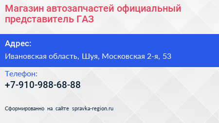 Магазин автозапчастей, официальный представитель ГАЗ по адресу Ивановская область, Шуя, Московская 2-я, 53 в дальнейшем Организация, размещена в следующих категориях: