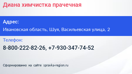 Диана, химчистка-прачечная по адресу Ивановская область, Шуя, Васильевская улица, 2 в дальнейшем Организация, размещена в следующих категориях: